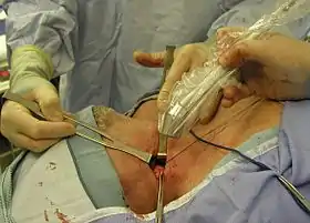 Lymphadenectomy or lymph node dissection is the surgical removal of one or more groups of lymph nodes.[1] It is almost always performed as part of the surgical management of cancer. In a regional lymph node dissection, some of the lymph nodes in the tumor area are removed; in a radical lymph node dissection, most or all of the lymph nodes in the tumor area are removed.[2][3][4]