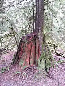 The park is covered in dense temperate rainforest that houses a wide array of organisms.[4] Like the neighbouring Lynn Canyon Park, Lynn Headwaters is a second growth forest. Cedar stumps can be seen throughout the park, reminding visitors of old logging practices.