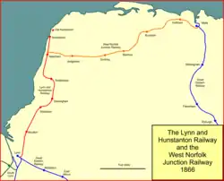 ![]() The Lynn and Hunstanton Railway and the West Norfolk Junction Railway in 1866 | |