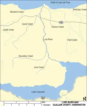 The Lyre River flows roughly northwest out of Lake Crescent, first encountering June Creek, then turning north at the point that is joined by Boundary Creek on the left. At River Mile 2.7 (48.12348°N 123.82684°W) the river tumbles down the Lyre River Falls, which are impassable to fish migrating upstream. Continuing north, the river is joined by Susie Creek on the left, and finally Nelson Creek on the right before emptying into the Strait of Juan de Fuca at Low Point.