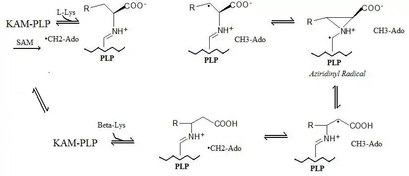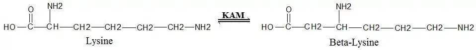 Lysine 2,3-aminomutase (KAM or LAM) (EC 5.4.3.2) is a radical SAM enzyme that facilitates the conversion of the amino acid lysine to beta-lysine.[1][2] [3][4] It accomplishes this interconversion using three cofactors and a 5'-deoxyadenosyl radical formed in a S-Adenosyl methionine (SAM) activated radical reaction pathway.[1] The generalized reaction is shown below: