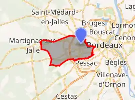 It is the largest suburb of the city of Bordeaux and adjoins it to the west. It is a member of the Bordeaux Métropole.