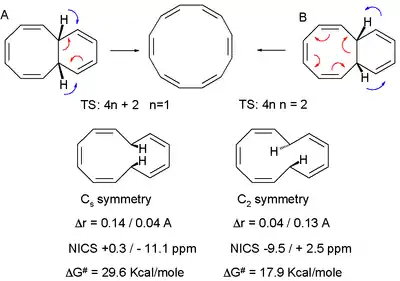 The difference was demonstrated in a hypothetical pericyclic ring opening reaction to cyclododecahexaene. The Hückel TS (left) involves 6 electrons (arrow pushing in red) with Cs molecular symmetry conserved throughout the reaction. The ring opening is disrotatory and suprafacial and both bond length alternation and NICS values indicate that the 6 membered ring is aromatic. The Möbius TS with 8 electrons on the other hand has lower computed activation energy and is characterized by C2 symmetry, a conrotatory and antarafacial ring opening and 8-membered ring aromaticity.