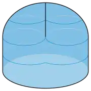 for .[51] Half of this Klein bottle, the subset with , gives a Möbius strip embedded in the hypersphere as a minimal surface with a great circle as its boundary.[52] This embedding is sometimes called the "Sudanese Möbius strip" after topologists Sue Goodman and Daniel Asimov, who discovered it in the 1970s.[53] Geometrically Lawson's Klein bottle can be constructed by sweeping a great circle through a great-circular motion in the 3-sphere, and the Sudanese Möbius strip is obtained by sweeping a semicircle instead of a circle, or equivalently by slicing the Klein bottle along a circle that is perpendicular to all of the swept circles.[50][54] Stereographic projection transforms this shape from a three-dimensional spherical space into three-dimensional Euclidean space, preserving the circularity of its boundary.[50] The most symmetric projection is obtained by using a projection point that lies on that great circle that runs through the midpoint of each of the semicircles, but produces an unbounded embedding with the projection point removed from its centerline.[52] Instead, leaving the Sudanese Möbius strip unprojected, in the 3-sphere, leaves it with an infinite group of symmetries isomorphic to the orthogonal group , the group of symmetries of a circle.[51]