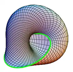 The edge, or boundary, of a Möbius strip is topologically equivalent to a circle. In common forms of the Möbius strip, it has a different shape from a circle, but it is unknotted, and therefore the whole strip can be stretched without crossing itself to make the edge perfectly circular.[48] One such example is based on the topology of the Klein bottle, a one-sided surface with no boundary that cannot be embedded into three-dimensional space, but can be immersed (allowing the surface to cross itself in certain restricted ways). A Klein bottle is the surface that results when two Möbius strips are glued together edge-to-edge, and – reversing that process – a Klein bottle can be sliced along a carefully chosen cut to produce two Möbius strips.[49] For a form of the Klein bottle known as Lawson's Klein bottle, the curve along which it is sliced can be made circular, resulting in Möbius strips with circular edges.[50]