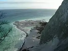Møns Klint is a 6 km stretch of chalk cliffs along the eastern coast of the Danish island of Møn in the Baltic Sea. Some of the cliffs fall a sheer 120 m to the sea below.[1] The highest cliff is Dronningestolen , which is 128 m above sea level.[2] The area around Møns Klint consists of woodlands, pastures, ponds and steep hills, including Aborrebjerg which, with a height of 143 m, is one of the highest points in Denmark. The cliffs and adjacent park are now protected as a nature reserve. Møns Klint receives around 250,000 visitors a year.[3] There are clearly marked paths for walkers, riders and cyclists. The path along the cliff tops leads to steps down to the shore in several locations.