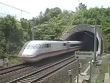 The Münden Tunnel (German: Mündener Tunnel) is a railway tunnel on the Hanover-Würzburg high-speed rail line in Germany. It is situated south of the town of Hann. Münden between Göttingen and Kassel.[1] At a total length of 10,525 metres, it is the second longest tunnel in Germany after the Landrücken Tunnel. The tunnel was built between 1983 and 1989. At the northern portal, which is located at 51°24′12″N 9°42′31″E, the trains cross the valley of the river Werra on the Werra Viaduct at Hedemünden, parallel to the A 7 autobahn. At the southern portal, (51°21′45″N 9°34′33″E) they cross the Ickelsbach valley, after which the Mühlenkopf Tunnel follows immediately.