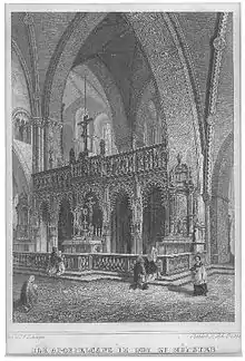 The rood screen of 1549 was an arcade or hall rood screen. Aside from this screen, the crossing choir was separated from the east transept, i.e. the Stephanus and Johannes choirs, by walls between the northern and southern pillars of the crossing respectively which was almost as high as the screen.
