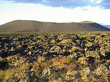 Postglacial volcanism in the Mývatn district may be divided into three cycles. The Lúdent [ˈluːˌtɛn̥t] cycle commenced shortly after the close of the Ice Age. The explosion crater (tephra ring) Lúdent dates from this cycle. Its eruption was followed by a number of small fissure eruptions. About 3800 years ago the shield volcano Ketildyngja [ˈcʰɛːtɪlˌtiɲca] was formed about 25 km south-east of Mývatn, and from it a huge lava flow, the Older Laxá-lava, spread over the southern part of the district, plunged down the valley Laxárdalur and flowed almost to the sea. This lava dammed up the first Mývatn, which was about as large as the present lake.