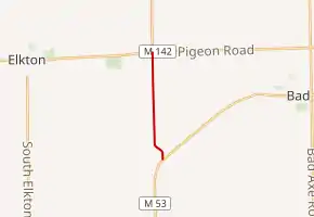 M-105 began at an intersection with M-53 (Van Dyke Road) in the small community of Popple, just before M-53 curved east towards Bad Axe. Known as Pinnebog Road, the trunkline traveled first north and then northwesterly, crossing the Pinnebog River. After intersecting Stein Road, M-105 turned due north for about three miles (4.8 km) through farm country and rural areas before meeting M-83 (Pigeon Road), a few miles east of Elkton. The highway served as a shortcut connector between M-53 and M-83.[1][4]