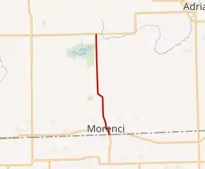 SR 108 crosses into Michigan on the southern edge of Morenci where it becomes M-156. From there the road continues northward on East Street through residential neighborhoods for about two-thirds mile (1.1 km) to Main Street near downtown where it turns west. The trunkline follows Main Street for three few blocks before turning north on North Street. The highway exits town near the Oak Grove Cemetery. M-156 follows Lime Creek Highway, which runs parallel to the stream of the same name, through farm land. Near the intersection with Morenci Highway, M-156 crosses a line of the Norfolk Southern Railway[4] in the community of Seneca. North of the rail crossing, M-156 follows Morenci Highway northward and passes to the east of Lake Hudson and the Lake Hudson State Recreation Area before terminating at a junction with M-34 in Clayton.[5][6]