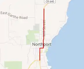 M-201 starts on the south side of the Northport at M-22 and runs north on Shabwasung Street. The highway turns east onto Main Street for one block; the area in town is predominantly residential. At the intersection with Waukazoo Street, the trunkline turns north until it meets Nagonaba Street where it runs west for a block before turning north onto Mill Street, passing near the marina. Heading out of the village, the highway crosses Northport Creek and passes some small farms. The designation ends at the village limits just south of the three-way intersection of Mill Street, County Road 640 (CR 640), and East Peterson Park Road. CR 640 continues northward to Leelanau State Park at the tip of the Leelanau Peninsula[1][3]