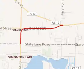 When the state highway system was initially signposted in 1919,[5] a highway numbered M-23 ran north from the state line near Union and turned east, eventually connecting all the way to Ypsilanti in Washtenaw County, east of Detroit.[6] On the original approved US Highway plan, M-23 was replaced by US 112, running over the border into Indiana.[7] Michigan diverted that highway along a route entirely within Michigan, and the very short, but locally important segment of cut-off highway became M-205.[2] The curve between Cassopolis and Redfield roads was realigned to give M-205 a more sweeping curve in 1950.[8] As part of the swap between MDOT and Cass County, M-217 was designated several miles to the east as a new connector to the toll road, and M-205 was transferred to local control on October 10, 2002,[3] decommissioning the trunkline.[9][10]
