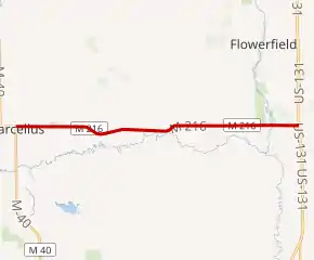 M-216 begins at a junction with M-40 in the village of Marcellus to the southwest of Kalamazoo.[3] The highway follows Main Street eastward in the village,[4] crossing a branch line of the Canadian National Railway.[5] East of town, M-216 passes through farm fields and jogs to the south around Lewis Lake. The highway runs along Marcellus Road through the rural landscape that is a mix of farm fields and woods. The trunkline crosses the Cass – St. Joseph county line before running through the unincorporated community of Howardsville in Flowerfield Township. After passing by the Pine View Golf Club, the road comes to its end at US 131.[3][4]