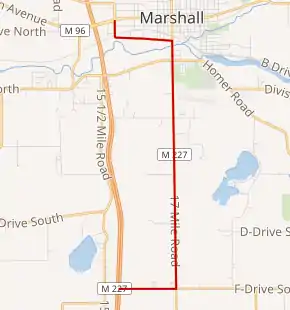 M-227 starts at a diamond interchange with Interstate 69 (I-69) at exit 32 between Tekonsha and Marshall. From I-69, M-227 runs east on F Drive South north of Pine and Long lakes for approximately one mile (1.6 km). The highway runs through agricultural land and turns north to follow Old US 27/17 Mile Road. At Division Drive, M-227 passes into Marshall on Kalamazoo Avenue. The highway runs past the Brooks Field airport and the Alwin Downs Golf Course. Kalamazoo Avenue crosses the Kalamazoo River, and M-227 turns west along Industrial Road. This section of town is an industrial park, and M-227 curves north onto West Drive,[3][4] crossing the Norfolk Southern Railroad.[5] The northern terminus is BL I-94 (Michigan Avenue) on the west side of Marshall, near I-69.[3] It lies only within Calhoun County and is entirely an undivided surface route.[4]