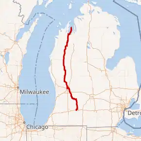 M-37 runs for 221.27 miles (356.10 km) through the western side of the Lower Peninsula of Michigan connecting Battle Creek, Grand Rapids and Traverse City. Segments of it have been listed on the National Highway System (NHS), a network of roads important to the nation's economy, defense, and mobility.[4] Through the Grand Rapids area, M-37 is on the NHS along Broadmoor and East Beltline avenues north of M-6 and the concurrency with I-96.[5] The second segment on the NHS runs from M-115 in Mesick to Traverse City.[6] The road has also been designated what is now a Pure Michigan Byway through the Old Mission Peninsula.[7] The trunkline is maintained by the Michigan Department of Transportation (MDOT). As part of this responsibility, the department tracks the traffic volumes along M-37. MDOT uses a metric called average annual daily traffic, which is a calculation of the average traffic level for a segment of roadway on any average day of the year. Along M-37, the volume varies from the peak 49,173 vehicles on a section of I-96/M-37 in Grand Rapids to the 718 vehicles at the northern terminus by the Mission Point Light.[8]