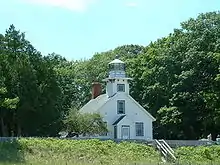 M-37 follows Center Road up the middle of the Old Mission Peninsula. This landform divides Grand Traverse Bay into its east and west arms. The highway runs along a ridge at the center of the peninsula offering views of each arm of the bay. This area contains the greatest concentration of cherry trees in the US.[14] These trees are said to "explode in a filigree of creamy pink blossoms in May" by the editors of Reader's Digest magazine.[15] The area is also famous for its vineyards and wineries.[16] The peninsula's seven wineries produce award-winning Rieslings, pinot grigios and chardonnays.[17] The first grapes were introduced to the region in 1983.[16] In the fall, the area is renowned for its colors in addition to the harvest. Besides cherries and grapes, apples are also grown in the area, contributing to the bounty each year.[18] At the tip of the peninsula is the Mission Point Light, a lighthouse that dates back to 1870. M-37 ends at a cul-de-sac in front of the building which is located near the 45th Parallel, halfway between the North Pole and the Equator.[14]
