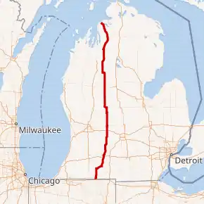 | Charlevoix | 266.399 | 428.728 | Northern terminus on the shore of Lake Michigan | |||