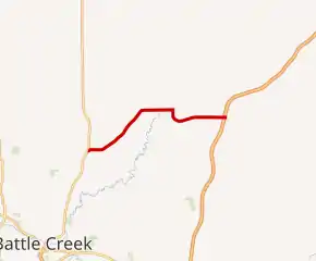 M-78 begins at an intersection with M-66 in Pennfield Township, north of Battle Creek in Calhoun County. The trunkline passes through rural farm lands as it runs due east and northeast. It briefly crosses the southeast corner of Barry County as it enters Eaton County. There M-78 follows Battle Creek Highway past some small ponds and into the town of Bellevue. The trunkline becomes Capitol Avenue in town and turns south onto Main Street in the middle of the central business district.[3][4] M-78 crosses a branch line of the Canadian National Railway before leaving town.[4][5] Main Street turns easterly and becomes Butterfield Highway. M-78 crosses the Battle Creek River before terminating at I-69's exit 48 in Bellevue Township.[3][4]