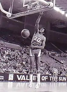During the 1975–76 ABA season, Carr played for the Spirits of St. Louis, averaging 12.2 points and 6.2 rebounds per game, and was named to the ABA's All-Rookie Team.[1] The Spirits of St. Louis were one of two ABA teams (the Colonels being the other) that did not join the NBA in the ABA–NBA merger,[1] and as a result Carr joined the NBA as a member of the Detroit Pistons from 1976–79. During the 1976-77 NBA season, Carr played all 82 games and averaged the second most points of any Piston at 13.3, behind only Bob Lanier.[3] The 1977 NBA Playoffs marked Carr's first postseason appearance, though Detroit, then in the Western Conference, were eliminated in the first round by the Golden State Warriors. On December 27, 1978, Carr set a career high with 36 points scored in a win against the Houston Rockets.[4] After being selected to the All-Defense second team upon the conclusion of the 1979 season for leading the league in steals at a career best 2.5 steals per game,[5] Carr was signed as a free agent by the rebuilding Boston Celtics. Pistons coach Dick Vitale responded by saying, "We just had the heart and soul ripped from our team." The Carr acquisition was one of the four major additions which immediately propelled the Celtics back to the top of the NBA standings after finishing near the bottom the previous season, along with majority owner Harry Mangurian, head coach Bill Fitch and rookie forward Larry Bird. Carr was instrumental in leading the Celtics' defense past the favored Philadelphia 76ers in the 1981 Eastern Conference Finals, on the way to Boston's 14th NBA championship. Playing for the Celtics until 1985, Carr averaged 9.7 points and 4.3 rebounds per game during his NBA career.