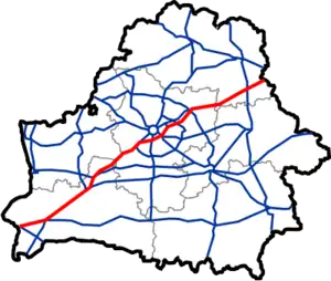 The M1 (Belarusian: Магістраль М1), Magistral Route Nr. 1, olimpijka (Russian: олимпийка)[1] is a main road crossing Belarus. It is a part of European route E30 and is the most important road in the country, connecting Moscow to Poland and Western Europe.