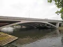 Runnymede Bridge is a multi-span arch bridge at the uppermost end of the Staines upon Thames and Egham Reach of the River Thames: above Penton Hook Lock and below Bell Weir Lock. It opened in 1961 to carry the A30's Staines Bypass.[2][3]