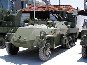 The M53/59 Praga is a Czechoslovak self-propelled anti-aircraft gun developed in the late 1950s. It consists of a heavily modified Praga V3S six-wheel drive truck chassis, armed with a twin 30 mm AA autocannon mounted on the rear for which the vehicle typically carries 900 rounds of ammunition, each gun being gravity fed from distinctive 50 round magazines. The vehicle has an armoured cabin.