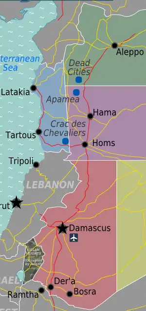 The M5 Motorway is the most important motorway in Syria due to its length and that it functions as the south-north backbone of the country network. It is known as the "International Road."[1] It connects the border with Jordan in the south with Damascus, the country's political capital, and continues further north through Aleppo, the country's economic capital and second largest city, to the border with Turkey in the north.[1][2]