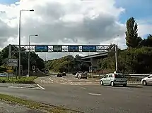 In 2004 the junction was further remodelled, so that traffic leaving the motorway and wishing to turn eastward on the ring road continues under the roundabout, and round to join the roundabout from the opposite site, so that it has a left rather than a right turn to make (via two sets of traffic lights).
