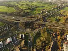 The northern end of the M606, closest to the city, was built with a large raised roundabout crossing the Bradford Ring Road, but the original plans to continue the motorway under the roundabout[1] were not carried out: access was only by slip roads to and from the roundabout.