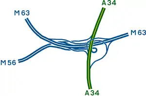 This section of motorway was the second section completed, opening as the M63 (and part as the M56 motorway) in January 1974. It was only a short section, running from what is now junction 2 of the M56 to junction 2 of the M60 (then junction 11 of the M63), but it included a very large free-flow junction providing links to the M56 and A34.