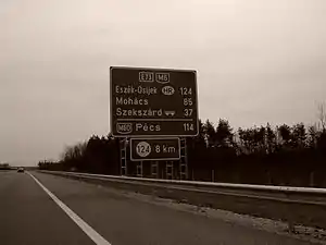 The M6 motorway (Hungarian: M6-os autópálya) is a north-south motorway in Hungary running along the Danube connecting Budapest to the seat of Baranya county Pécs, and further south to the Croatian border.