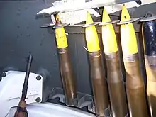 The vehicle carried 80 37 mm rounds (16 in the turret and 64 in an ammunition rack in the right sponson) when fitted with a single radio. Vehicles with a second radio installed only carried 16 main gun rounds. Some units solved this problem by cutting up the removed main ammunition rack and stowing 18 rounds in each sponson, under the radios. This raised the number of main gun rounds able to be carried to 52. Another modification (the most common one) involved fabricating (again from the discarded main ammunition rack) a 43-round bin to be placed behind the driver's seat, and a 20-round bin attached to the framing of the turret basket. This raised the ammunition capacity up to 79 rounds.[1] Machine gun ammunition consisted of 1,500 .30 caliber rounds and 400 .50 caliber rounds. In addition, the vehicle carried a mix of 16 smoke and hand grenades, four smoke pots, six M1 anti-tank mines and four M1 carbines for the crew.
