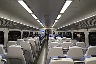 The M9s and M9As are equipped with numerous customer amenity improvements over their predecessors. The cars are equipped with wider seats, closed loop seat armrests similar to those on the M8s, electrical outlets on both sides of the car in each row of seats, four 32-inch multimedia screens in each car, four to six additional seats per married pair, and powered doors on the "B" end of each car. The flip-up seats are equipped with a suspension system to prevent them from slamming. All M9s will be equipped with positive train control (PTC) and CCTV cameras that allow the train crew to view the passenger areas of the train.
