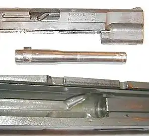 MAB PA-15 is a delayed blowback operated, semi-automatic pistol. It featured Savage-type, rotating, but not reciprocating, barrel, which has two lugs: one under the chambers is engaged in the frame and allows to the barrel to rotate but not to move back or forward. The other lug, on the upper surface of the barrel, is engaged in the curved-shaped notch inside the slide. When the pistol is fired, the barrel inertia and the bullet torque acted against the blowback force of the slide via the slope-shaped part of the notch. When bullet leaves the barrel, the slide rotates barrel and retracts to cycle the action. MAB PA-15 has a frame mounted safety, on the left side of the frame, and also internal magazine safety, which does not allow the gun to be fired with magazine removed.