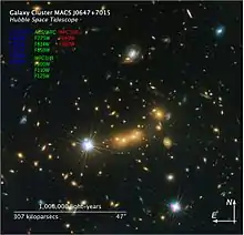 During 2012 the galaxy cluster was announced as gravitationally lensing the most distant galaxy (MACS0647-JD), then ever imaged (z = 11).[4][5][6][7]