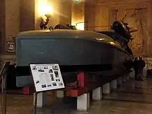 The main Austrian fleet remained securely at anchor in the harbour at Pola (now Pula in Croatia), protected by several layers of defensive booms, impassable to conventional MAS boats. A special version, the Grillo-class tracked torpedo motorboat or Barchino Saltatore (Jumping Boats), officially classified classified as tank marino (sea tank) or MAS speciale, were designed by 1918.[2] The craft featured a pair of spiked continuous tracks, intended to allow them to clamber over the booms which were supported by large timber baulks. The boats were powered by an electric motor for a silent approach and carried two torpedoes. Four were built; the first two were scuttled when their slow motors failed to get them to the harbour booms at Pola before daybreak and in a second operation, another boat made such a loud clattering noise climbing the booms that it was spotted and destroyed by gunfire.[3]