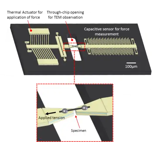 Later on, Taher Saif at University of Illinois- Urbana Champaign can be credited on developing microfabricated stages.[6] Several results in situ SEM and TEM were demonstrated for thin films by his group[7] including a stage for simultaneous electrical and mechanical testing, although this set-up used external actuation and sensing.[8] A major breakthrough in MEMS-electronic integration was made by Horacio D. Espinosa and his group at Northwestern University. They designed and developed a true MEM system that incorporated capacitive sensing for electronic measurement of load and thermal actuation for specimen straining in one single chip.[9] The system could be operated inside a transmission electron microscope. The MEMS based platform was applied to the study of poly-Silicon samples,[10] multi-walled CNTs[11] and more recently metallic[10] and semiconducting nanowires.[12][13] In particular, the theoretical strength of carbon nanotubes was experimentally measured for the first time using this device.[11]