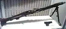 For the medium machine gun role a large tripod, the Lafette 42, was available that included a number of features, such as recoil absorbing buffer springs, a Zielfernrohrhalter (optical sight mounting bracket) for mounting an MG Z 34 or MG Z 40 periscope-type 4× power telescopic sight containing special sighting equipment for indirect fire, or the late World War II MG Z 44, designed for direct fire only.[46] Fitting such an optical sight enabled the machine gun to deliver direct fire out to 3,000 m (3,281 yd). An accessory to lengthen these sights' periscope was available to use these sights behind cover. The Lafette could be set up in a prone, kneeling or high position. The Lafette 42 weighed 20.5 kg (45.2 lb) on its own and was a simplified version of the Lafette 34 used for the MG 34, as the MG 42 could be operated more easily from a Lafette and featured no semi-automatic firing mode. The legs could be extended with a Lafetteaufsatzstück to allow it to be used in the low level anti-aircraft role, and when lowered, it could be placed to allow the gun to be fired "remotely" while it swept an arc in front of the mounting with fire. Mounted to the Lafette and aimed through the MG Z 34 or MG Z 40 telescopic sight, the effective range of the MG 42 could be extended out to 3,500 m (3,828 yd) when fired indirectly. The Lafette 42 tripod also had a bolt box to store a (spare) bolt and return spring.[47]