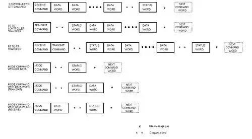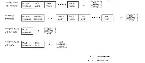 This means that during a transfer, all communication is started by the Bus Controller, and a terminal device cannot start a data transfer on its own. In the case of an RT to RT transfer the sequence is as follows: An application or function in the subsystem behind the RT interface (e.g. RT1) writes the data that is to be transmitted into a specific (transmit) sub-address (data buffer). The time at which this data is written to the sub-address is not necessarily linked to the time of the transaction, though the interfaces ensure that partially updated data is not transmitted. The Bus controller commands the RT that is the destination of the data (e.g. RT2) to receive the data at a specified (receive) data sub-address and then commands RT1 to transmit from the transmit sub-address specified in the command. RT1 transmits a Status word, indicating its current status, and the data. The Bus Controller receives RT1's status word, and sees that the transmit command has been received and actioned without a problem. RT2 receives the data on the shared data bus and writes it into the designated receive sub-address and transmits its Status word. An application or function on the subsystem behind the receiving RT interface may then access the data. Again the timing of this read is not necessarily linked to that of the transfer. The Bus Controller receives RT2's status word and sees that the receive command and data have been received and actioned without a problem.