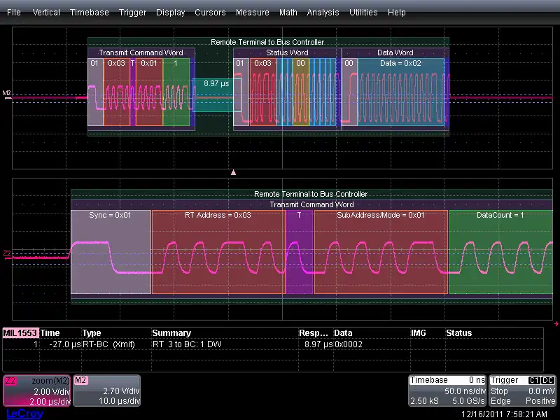 The image below exemplifies many of the protocol and physical layer concepts explained above. For example, the RT address contained in the Command Word has a value of 0x3 (in range of 0 to 31). The sixth bit is 1, indicating a Transmit from the RT. The sub-address is 0x01. The last 5 bits indicate the number of words to expect take a value of 1, which is matched by the single Data Word (value 0x2) after the Status Word.