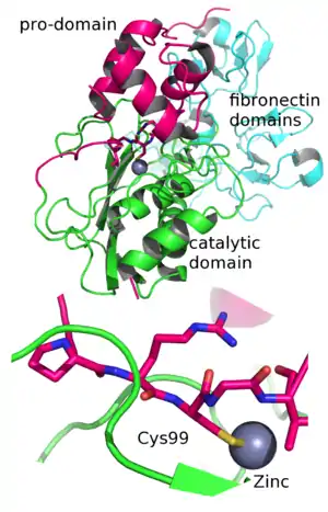 ProMMP9 (pro-peptide (red), catalytic domain (green) with fibronectin domains (cyan), with detail of the "cysteine switch" (from PDB entry 1L6J)