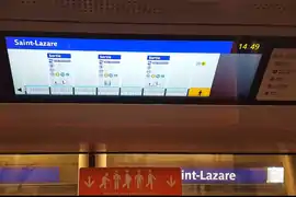 Passenger information is provided by AVSA (Annonces Visuelles et Sonores Automatiques), with an illuminated line plan above the doors, as well as audible announcements. There are also LCD screens which display the next stop and connections, the destination of the train, the geographic route of the line and — when approaching the station — the plan of the platforms and exits in relation to its position in the train, similar to displays in Japan.