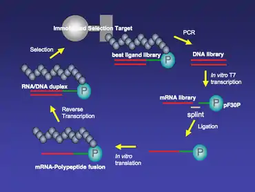 - Roberts RW, Szostak JW (1997). "RNA-peptide fusions for the in vitro selection of peptides and proteins". Proc Natl Acad Sci USA. 94 (23): 12297–302. Bibcode:1997PNAS...9412297R. doi:10.1073/pnas.94.23.12297. PMC 24913. PMID 9356443.