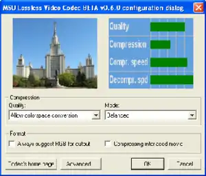 The MSU Lossless Video Codec is a video codec developed by the Graphics & Media Lab Video Group of Moscow State University. It was designed to provide space-effective lossless video compression. As of 2007 MSU had the second best compression ratio when compared to many other lossless video codecs,[1] with the better result shown by YULS codec.