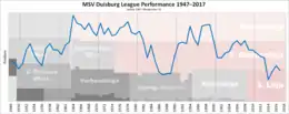 After being demoted to the 3. Liga in 2013, Duisburg was promoted to the 2. Bundesliga for the 2015–16 season. The team placed 16th and lost the playoffs, therefore the team was dropped back to the 3. Liga for the 2016–17 season. They won the 3. Liga and were again promoted to the 2. Bundesliga next season.