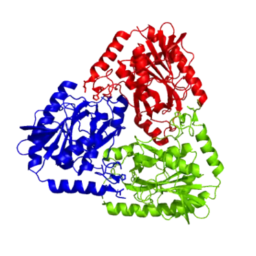 MTAP is a trimer enzyme that shares a similar structure and functions with mammalian purine nucleoside phosphorylases (PNPs) which are also trimeric enzymes.[18] MTAP’s subunits are identical in structure and composed of 283 amino acid residues that form to the size of about 32 kDa each.[8][18] The main structure of an MTAP subunit is comprised of eleven beta-sheets with six alpha-helices intermixed.[18] The active site of the enzyme is made up of beta-sheets five and 11, as well as alpha-helix 5, and four separate residue loop structures.[18] Within MTAP, helix six is a 12-residue C-terminal helix that arranges for the leucine residue 279 of one subunit to be a part of the active site of another subunit.[18] The active site of each subunit includes two residues (His137 and Leu279) from a neighboring subunit, relying on the interactions between the subunits for proper enzymatic activity.[18] MTAP contains an active site with three regions that correspond to a base, methylthioribose, and sulfate/phosphate binding site.[18]