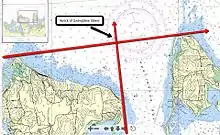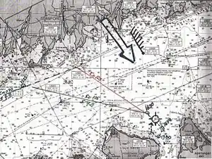 The question is - did Dickman turn his tug ESE after passing the Captain Islands, and begin taking the NW wind (large arrow on chart below) on the port quarter, or did he continue another half an hour till the tug was abeam of the Stamford breakwater, a familiar landmark to him, and then turn southeast. This route would have allowed for the wind and sea to follow the tug, and reduce the rolling. It is my thought that had he continued along his course, he would have been abeam of Stamford at 1600, and may have opted for putting into harbor there, as it was well protected and deep enough for the tug's draft.