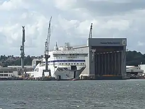 Brittany Ferries ordered Honfleur in June 2017 from German shipbuilder Flensburger Schiffbau-Gesellschaft (FSG) at a cost of about €200 million.[1][2] Construction began in March 2018 when the first steel was cut, followed by the laying of the keel several months later.[3][4] She was launched in December 2018,[5] and following fitting out was scheduled to be delivered in May 2019 before entering service the following winter season.[4] Once in service, she was to sail between Portsmouth, England and Caen, France.[1]