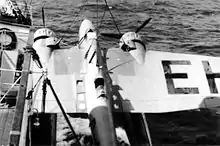 In the Spanish Civil War Monte Pascoal repatriated 226 German volunteers from Sevilla back to Hamburg in June 1937.[6] In January 1939, a Heinkel He 115 aircraft, registration D-AEHF, suffered an engine failure over the Atlantic Ocean. The aircraft landed alongside Monte Pascoal, which rescued the crew and lifted the aircraft from the water using a derrick at the bow of the ship.[7]